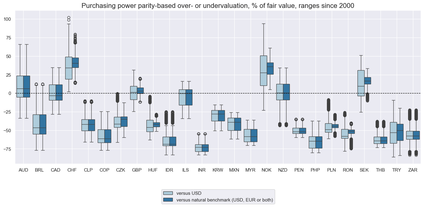 First, we translate the overvaluation ratios of the 25 currencies in our analysis to overvaluation percentages, as % of the PPP value and against the dominant benchmark currencies rather than the USD alone. The below box-and-whisker chart shows the ranges of these valuation percentages and conveys a well-known reality: PPP-based overvaluation and undervaluation are persistent, and ranges of countries with different governance and stages of development may never overlap. Put differently, the strict law of one price does not hold, even over multiple decades. This makes intuitive sense, as nothing is perfectly tradable, and countries with lower productivity should have lower prices for local content, such as services.