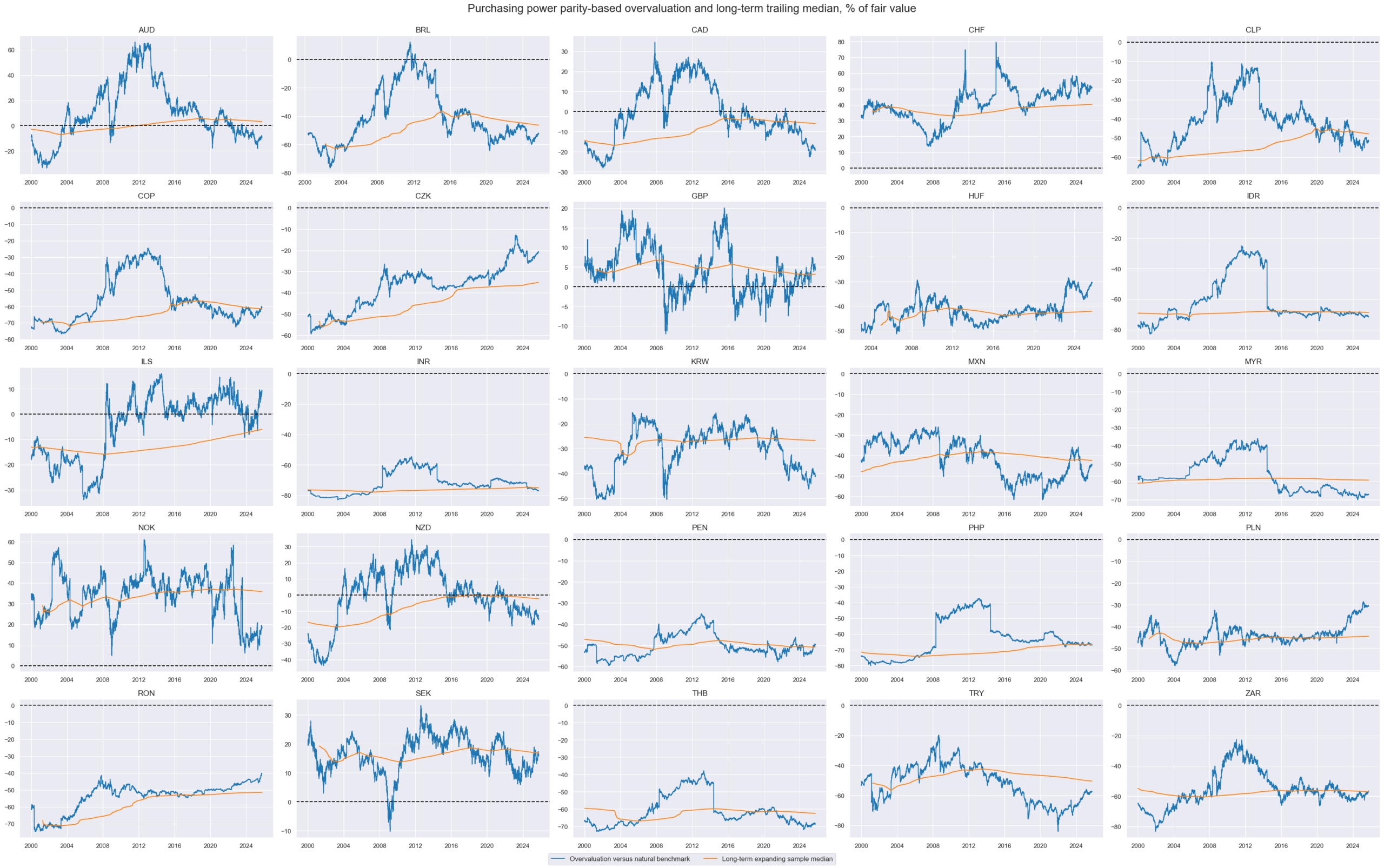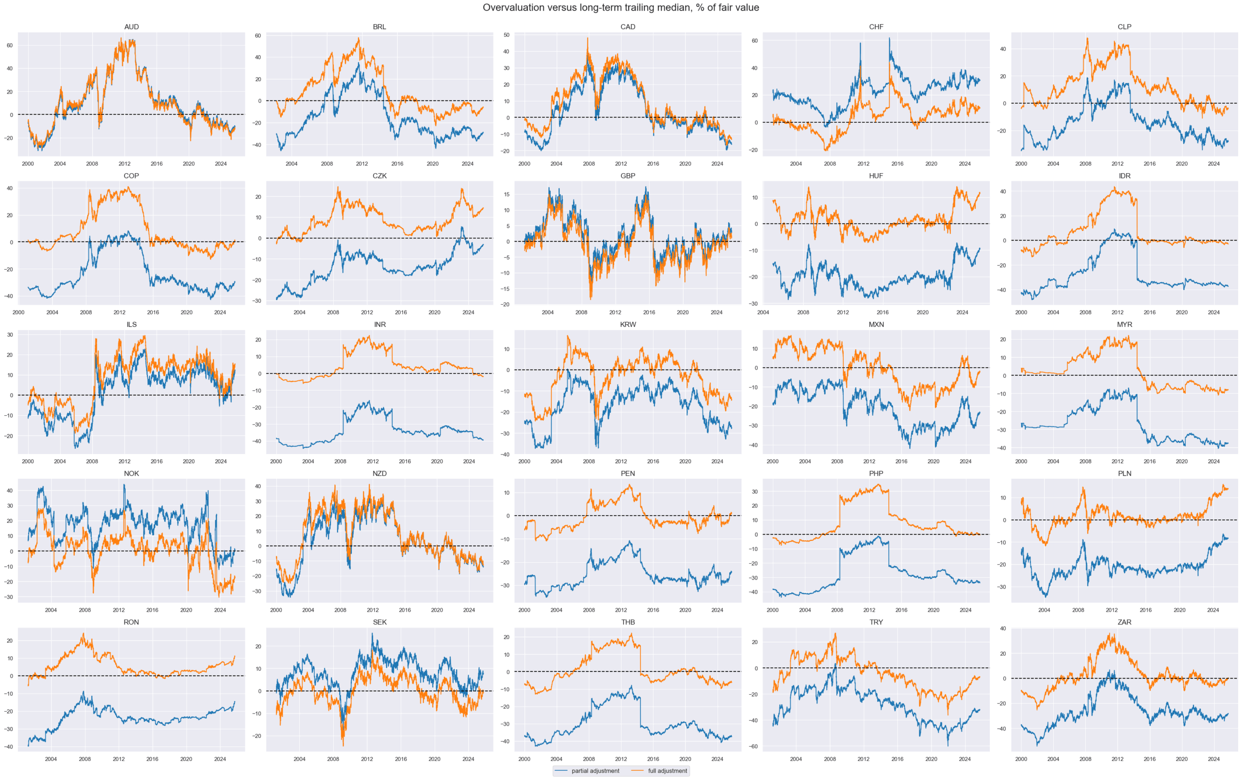 Second, we adjust overvaluation ratios for long-term median values to account for structural differences in purchasing power. In particular, we calculate for each date a median overvaluation percentage since inception (typically early 1990s) based on available data up to that date and subtract this median from the concurrent overvaluation metric. The outright overvaluation and the long-term trailing medians are displayed in the panel below.