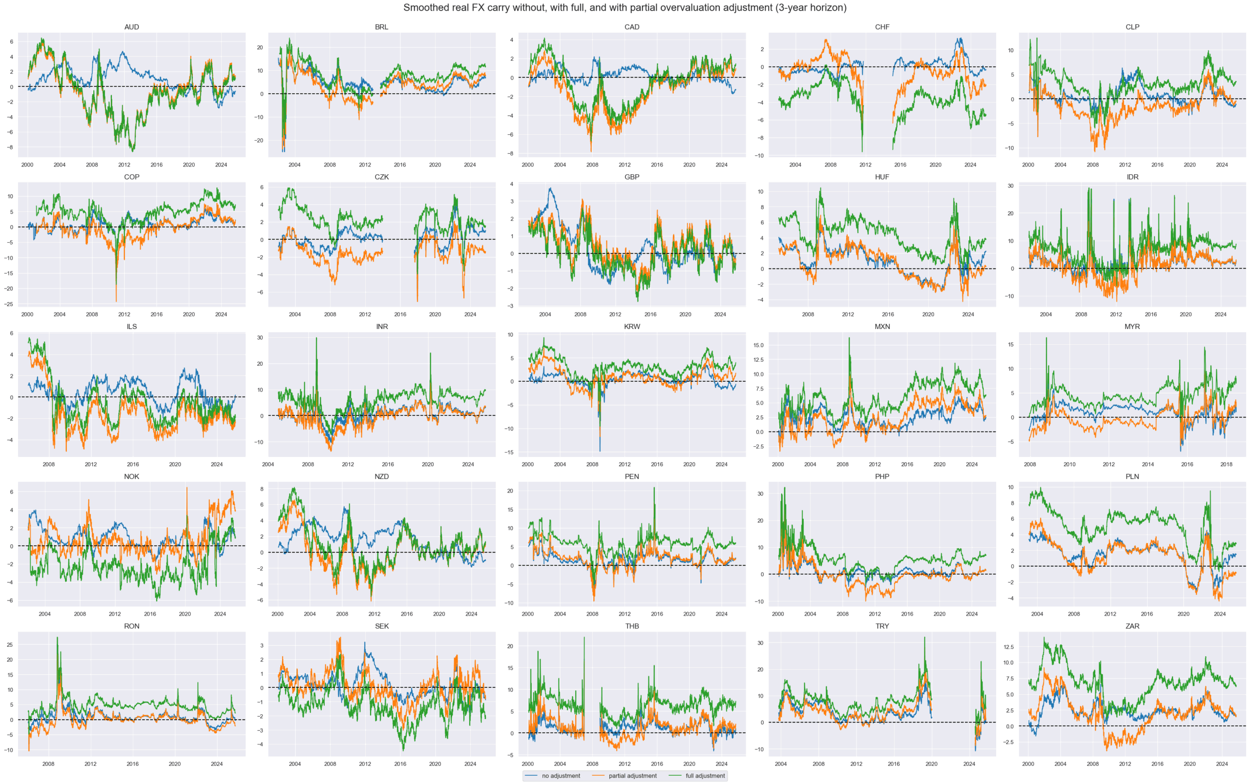 FX forward-implied carry is a popular ingredient in currency trading strategies because it is related to risk premia and implicit policy subsidies. Its signal value can often be increased by considering inflation differentials, hedging costs, data outliers, and market restrictions. However, even then, FX carry is an imprecise and noisy signal, and previous research has shown the benefits of enhancements based on economic performance (view post here). This post analyses the adjustment of real carry measures by currency over- or undervaluation. As a reference point, it uses point-in-time metrics of purchasing power parity-based valuation estimates that are partly or fully adjusted for historical gaps. The adjustment is conceptually compelling and has historically increased the performance of carry signals across a variety of strategies.