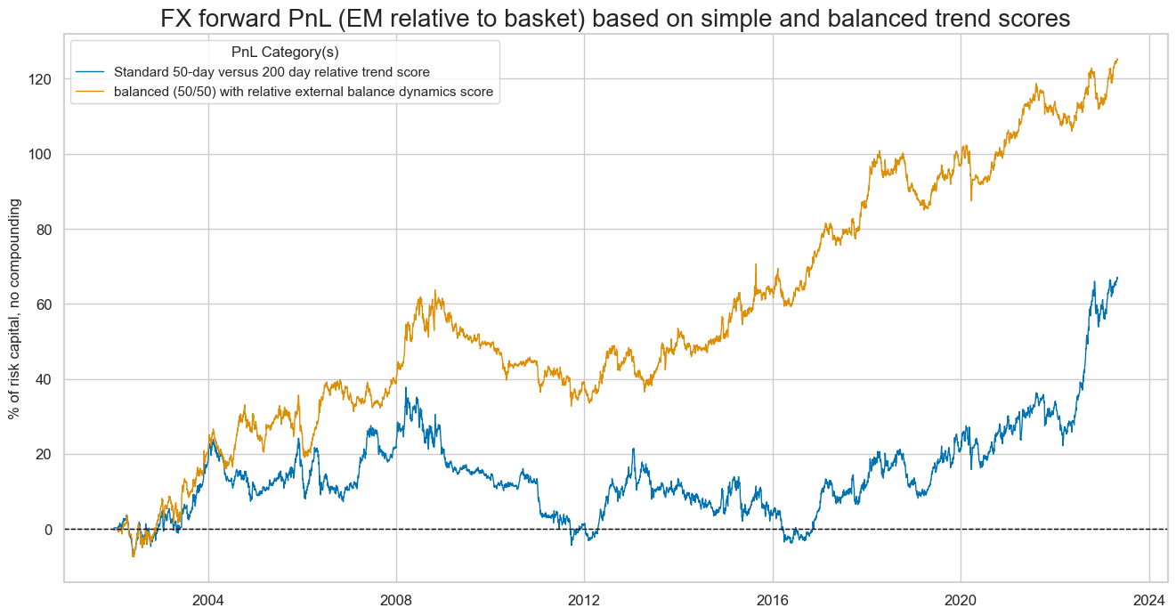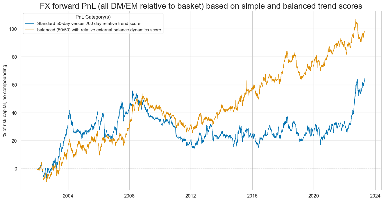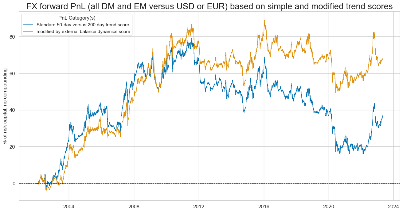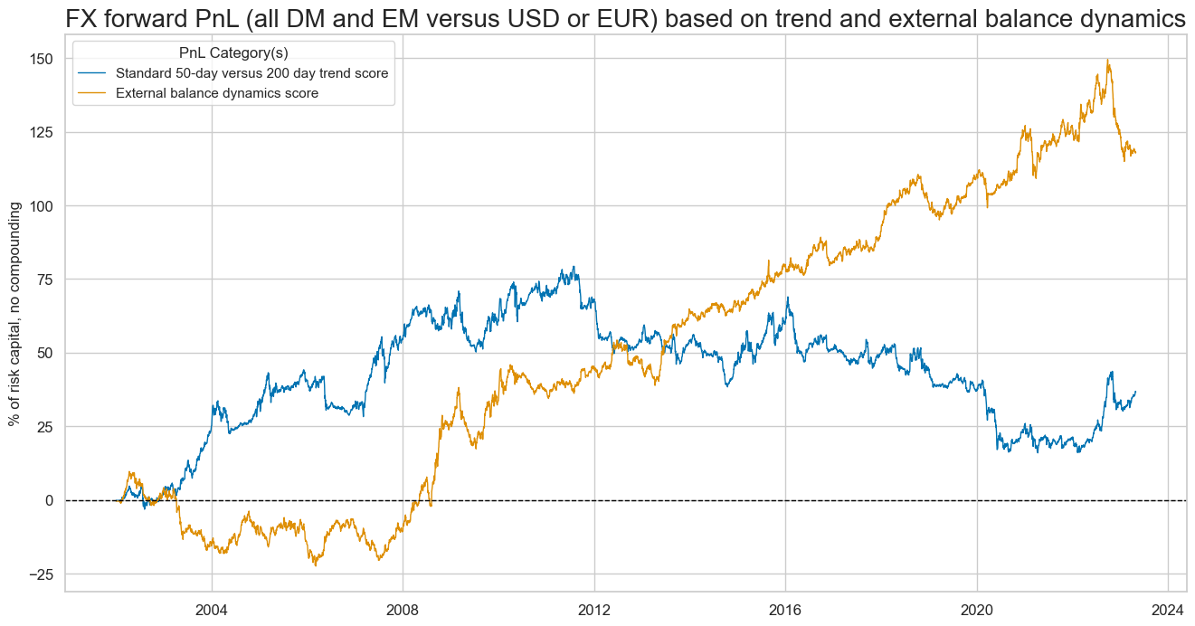 We tested if the consideration of external balances benefits a simple trend-following strategy for developed and emerging markets FX forwards from 2002 to April 2023. The panel thus encompasses the era of broad exchange rate flexibility and convertibility in the EM space and features 27 currencies. It excludes some intermittent periods for currencies whose flexibility, liquidity, or convertibility were restricted.