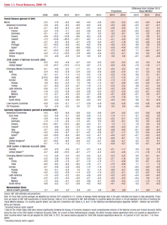 “In 2014, the average pace of fiscal consolidation, as measured by the change in the cyclically adjusted balance, is projected to ease to 0.4 percent of GDP, from 1¼ percent of GDP in 2013.”